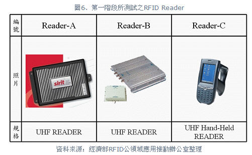第一階段共測試6種 UHF 標簽如圖5、3款讀取器如圖6(2款固定式、1款手持式)。第一階段基本驗測結果可匯整如表1所示: