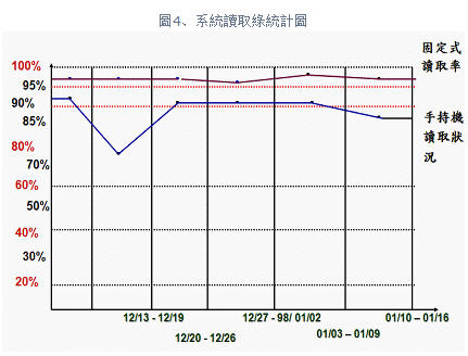 從圖4所示,目前就手持機人工讀取的讀取率部分,往往因不明原因造成無查核記錄,讀取狀況不穩定甚至比自動化門哨略低,探其原因并非讀取器一次性讀取效能的問題。歸納主因為:人為疏忽,狀況有以下幾點。