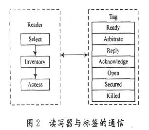 目前尚未有全球統一的RFID規范,主要有ISO18000系列標準,歐美的EPC規范和日本的UID規范等。在EPCglobal Class一1 Generation一2協議中,讀寫器采用選擇(Select)、盤存(Inventory)、訪問(Access)三個基本操作管理標簽群,同時標簽根據閱讀器的操作有就緒(Ready)、仲裁(Arbitrate)、應答(Reply)、確認(Acknowledge)、開放(Open)、保護(Secured)、殺死(Ki11)七種狀態,如圖2所示。