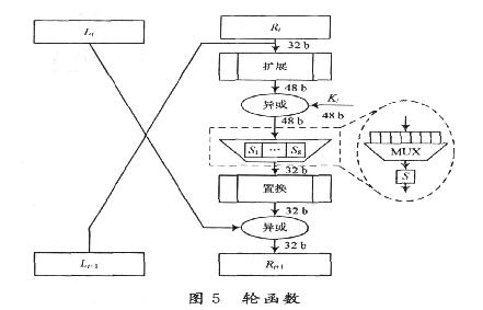 DES算法的核心是一個輪函數,明文數據經過初始置換后進行16次輪函數的操作,最后經過一個逆初始置換輸出結果。在每一次輪函數中所使用的密鑰Ki是初始密鑰經過置換后的,所以每一輪的密鑰都不同;對于輸入的64 b明文,分成長度相同的兩部分Li,Ri,則輸出給下一輪的64 b數據為: