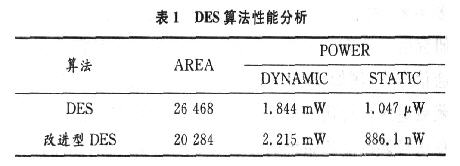 該設計以減少芯片面積為主要目的,在原有的DES加密算法基礎上進行改進,并用Synopsys公司的綜合工具DesignCompiler分析了改進后系統的性能,綜合使用的是stoic 0.18μm工藝庫,性能比較如表1所示。