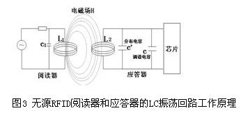 圖3所示為無源RFID閱讀器和應答器的LC振蕩回路工作原理[2]。閱讀器中有由線圈L1電容C1構成的LC振蕩回路1,這個振蕩回路可以產生頻率為f0的交變磁場。應答器中線圈回路的分布電容C’和外接調諧電容C共同構成電容C2與線圈L2并聯形成LC振蕩回路2,其諧振頻率為f,當應答器線圈置于閱讀器的交變磁場中并且其諧振頻率f與閱讀器交變磁場的頻率f0相同時,振蕩回路1、2產生諧振。諧振使閱讀器天線線圈產生非常大的電流,使應答器線圈上的感應電壓達到最大值,經二極管整流后作為穩定的電壓給微型芯片提供工作所需要的能量,完成閱讀器對芯片上的信息讀寫[3-4]。