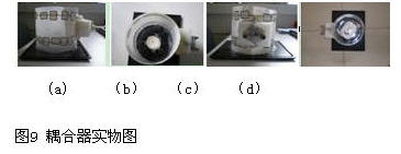 耦合器結構如圖8所示,粘在底座6上的圓柱體1是由1mm厚的硬質塑料板或硬質紙板圍成的半徑為R的空心筒體。導線2,4分別在筒體1表面繞成緊密相挨的兩圈, 其垂直距離L等于筒體1的半徑R。支撐塊3粘在筒體1的外壁上,其內部安裝兩個BNC接頭7、8、變壓器鐵芯9、兩個變壓器線圈10、11以及兩個調諧電容,圓筒體1中間有圓柱體擱臺5用來放置待檢測的電子標簽。圖9(a-d)所示為耦合器實物圖。