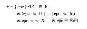 filter 是根據所給規則對數據進行過濾篩選,找出符合過濾條件的標簽數據。整個filter命令包含若干includePattern 和若干excludePattern,結果集為包含于任何一個或多個includePattern 中但是不包含于任何一個excludePattern 中的EPC 碼。用集合形式表示為: