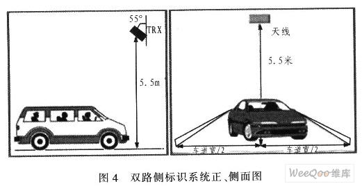 多路徑路測標識采用廣播發射式,安裝在產生多路徑交叉口路測,根據車輛來往方向向電子標簽中寫入車輛的行駛路徑記錄,具體參數與車道路測標識單元一致。圖4給出雙路側標識系統圖。