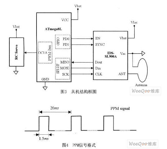 從機的硬件連接如圖3所示,主控單片機為ATMEGA8L;有源RFID標簽為IDS—SL900A;執行器為Futaba系列舵機中的S3110微型舵機。其中,ATMEGA8L通過SPI接口和兩個通用輸入\輸出接口與RFID標簽連接以讀取標簽中的數據并對標簽運行參數進行配置。S3110舵機的控制信號是PPM(Pulse Position Modulation)信號,這是一種脈寬調制信號,周期為20ms,其中,正脈沖的寬度決定了舵機的轉動角度,范圍從1ms到2ms,分別對應舵機的額定轉角的最小值和最大值。圖4為PPM信號的格式,該信號由ATMEGA8L內部定時計數器l產生,并經輸出比較接口0ClA輸出至S3110。