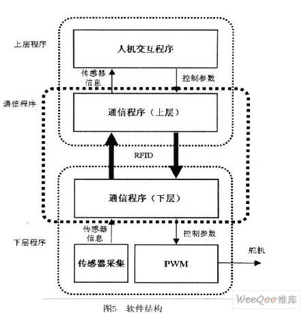 系統采用一主多的上下層結構,所有從機都工作在PC的監控下,并通過運行于PC上的圖形化界面接收用戶指令。根據系統的結構特點以及系統各部分所實現的功能,可以將系統軟件劃分為人機交互程序、數據通信程序以及傳感器和執行器的控制程序三個部分,如圖5所示。