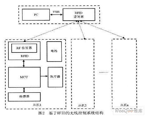 基于 RFID 的分布式無線控制系統主要包括一個具有 RFID 讀寫功能的主控 PC 以及多個具有 RFID 標簽的從機。其邏輯結構如圖2所示,分為上下兩層,上層由 PC 和 RFID 讀寫器組成,其中,RFID 讀寫器通過 USB 接口和 PC 連接。下層由多個從機構成,每個從機都包括單片機、傳感器、執行器、RFID 標簽以及電池五個部分。上層結構負責整個系統的協調和管理任務,它可以獲取所有從機的傳感器信息和運行狀態,并由此來規劃和協調各個從機的行為。