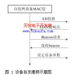 無線傳感器網絡最初是由全功能設備(FFD)的節點發起并建立,無線傳感器網絡建立后,此發起設備就作為整個網絡協調器,該協調器可以通過串行接口和PC相連接,處理接收到的各種數據,也可以和其他異種網絡進行數據交換。節點自發建網過程如下:FFD節點首先進行信道能量檢測(ED),選取檢測到的能量峰值最小的那個信道作為要建立的無線傳感器網絡的數據傳輸信道;然后在此信道上發送跨網信標(beacon)請求幀,用以獲取節點操作范圍內其他無線傳感器網絡信息參數,在接收到beacon幀后,選擇未被使用的網絡標號,最后根據已確定的網絡信道號、網絡標號及其他相關參數來設定硬件中相關寄存器的值,至此無線傳感網中網絡協調器就形成了。圖2是設備自發建網示意圖。
