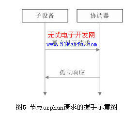 無線傳感器網絡除了節點有自組網能力外,還具有自愈和自節能的特點。當某一節點因為某種客觀環境原因或是原傳感網參數發生變化,導致此節點和傳感網脫離,脫離節點可以發送孤立(orphan)顯示請求幀給協調器,協調器在接收到請求幀后確定此節點是不是自己原先的孩子節點,在做出判定后向該節點發送響應幀,以確定是否重新接收該節點為自己的孩子節點。圖5 為orphan請求的握手示意圖。