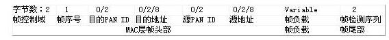 Zigbee協議定義了四種幀,分別是:命令幀,數據幀,beacon幀,確認幀。通用幀的格式如表1所示: