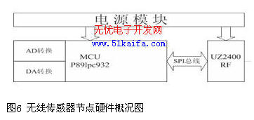 在測試中,我們使用三個無線傳感器節點來構建對等網絡。其中,有一個節點通過串口和PC相連,作為網絡協調器,通過它可以將采集到的數據交給PC機。無線傳感器節點主要以Philips公司的p89lpc932單片機為核心,無線數據收發芯片采用Ubec公司的基于zigbee協議的UZ2400,節點硬件概況圖如下。通常情況下節點一般處于休眠狀態,當有中斷請求時激活節點工作,接收數據。