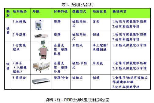 (1) 此次驗證主要針對移動式醫療儀器與設備,測試多款RFID產品的讀取率、厘清技術疑點,并測試被動式金屬標簽讀取效果。