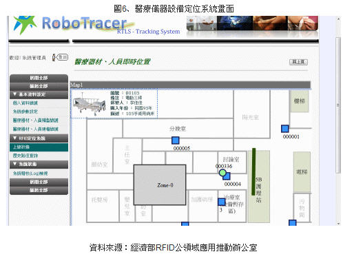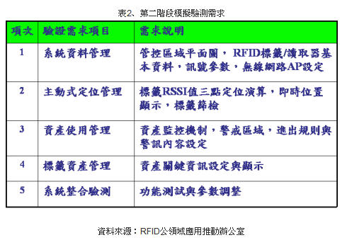 國內主動式RFID的產品在近五年已歷經不同的教學及區域醫院的應用,而被動式RFID在資產管理上,也有相對應的金屬標簽產品;而在定位系統開發方面,亦有業者積極投入,所謂的即時定位系統(Real-Time Location System, RTLS)將是全球主動式RFID應用的趨勢。透過此次的概念驗證,將可整合我國業者在軟硬體的實力,為新一代資產或人員定位管理整體解決方案鋪路。