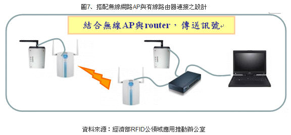(5) 可搭配無線網路AP與有線路由器連接各讀取點,接收標簽訊號,以延伸讀取范圍,涵蓋完整的管控區域(如下圖示)。