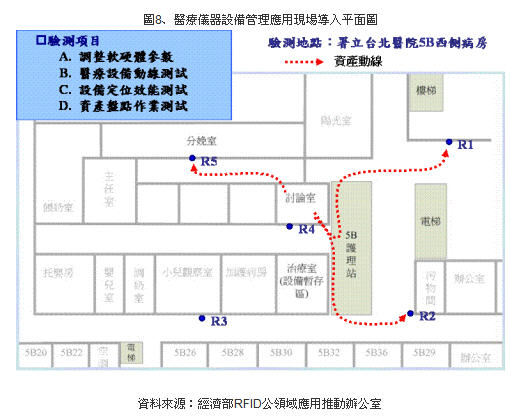 此次醫療儀器設備管理應用概念驗證在行政院衛生署署立臺北醫院的積極配合下,與九家業者共同完成被動式及主動式RFID硬體的性能測試及資產辨識定位管理系統的雛形。署立臺北醫院為衛生署所屬醫院北區區域聯盟管理委員會管理中心所在,執行各項資源整合業務。醫院擁有近600張病床,年平均住院人次達12,000,是衛生署所屬28家醫院之一。歷年來致力推動醫療品質與病人業務與國際接軌,其血液透析整合資訊系統于98年更獲得國際健康照護品質協會(ISQua)之肯定,為國內血液透析照護之典范。 98年于衛生署“振興經濟新方案-擴大公共建設投資-‘加速辦理智慧醫療照護計劃’”下,與其他10家醫院進行“醫院安全關懷RFID計劃”,而且是11家醫院中導入RFID應用系統最完整的醫院,包含病患管理、用藥安全、貴重儀器管理、開刀房動向管理等共十一個RFID子系統。