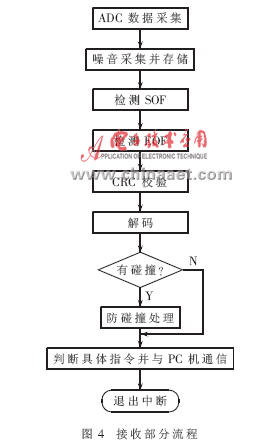 讀寫器應用于開放式門禁系統時,需要PC機監控,兩者以主從方式工作。主控模塊上電復位完成初始化后,進入等待狀態。當PC機發來指令后,中斷喚醒主控模塊接收指令并處理相應程序,完畢后將信息返回PC機并再次進入等待狀態,總體流程如圖3所示。當中斷喚起讀寫器發送命令并已檢測到有標簽進入時,便進行接收。接收部分流程如圖4所示。主控模塊在發出命令后,立即對模擬板發來的信號ADC采樣,并不斷采集噪聲,隨后完成檢測數據、解碼、校驗、防碰撞等處理,最后將標簽信息發回PC機,退出中斷。