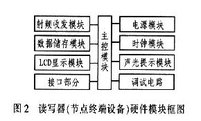 系統設計的重點在于節點終端設備的設計,即超高頻RFID讀寫器的設計。讀寫器的主要功能是發出詢問信號,選擇能量場內的應答器,建立數據通信鏈路并對應答器進行讀寫操作。超高頻RFID讀寫器的數據采集距離較遠,可達到1~30 m,通過軟件設置射頻收發模塊增益大小來控制讀寫距離,靈活地滿足實際要求。讀寫器硬件按照不同的功能可劃分為主控模塊、射頻收發模塊、電源模塊、數據存儲模塊、接口部分、時鐘模塊、LCD顯示模塊、聲光提示模塊及調試電路等,具體如圖2所示。