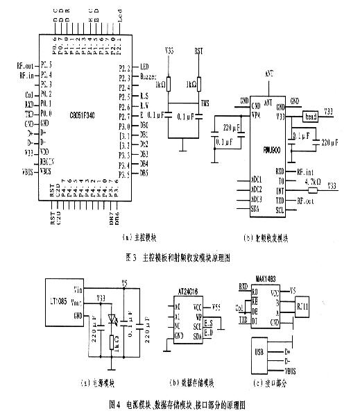 (2)射頻收發模塊選用RMU900超高頻讀寫模塊。該模塊通過天線解調、解碼射頻標簽發射的信號,把數據發送給主控器件實現數據的采集,或將命令和數據編碼、調制后經天線發送給標簽,實現對標簽的寫操作。數據的傳輸通過與C8051F340的串口O相連的TX0和RX0實現。圖3為主控模板和射頻收發模塊原理圖。