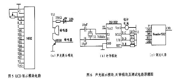 (6)其他模塊1602單色液晶顯示屏,可顯示采集到的數據和操作時間或實時時間。顯示數據的傳輸采用并行傳輸的方式,加快了屏幕的刷新頻率。聲光提示模塊提示操作完成情況。主要通過主控器件的I/O端口控制LED閃爍和蜂鳴器的鳴笛。時鐘模塊顯示數據采集的時間或實時時間。除板載電源外還設計有備用的紐扣電池,使掉電時時鐘不丟失。調試電路實現在線編程,向主控器件C8051F340燒寫程序,監測變量值的變化情況,調試程序,輔助完成軟件的編寫。圖5、圖6為上述模塊的原理電路圖。