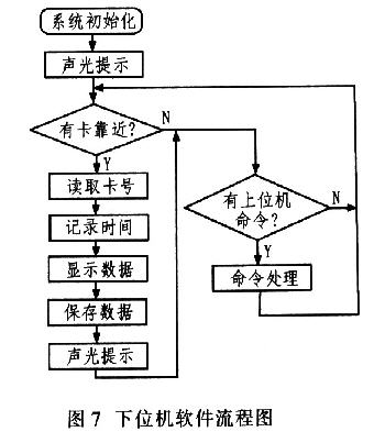 系統的軟件設計包括上位機軟件和下位機軟件兩部分。上位機軟件部分主要針對計算機平臺,采用C++語言編寫.控制節點終端設備和接收節點終端設備發送的數據,然后做進一步處理。考慮到網絡的規模最大為256節點,上位機采用輪詢方式控制各個節點終端設備,維持整個網絡正常運行。控制節點終端設備的命令主要有:(1)發送數據命令:下位機接收到該命令的響應是發送采集到的數據,即緩存在數據存儲模塊中的數據;(2)寫標簽命令:下位機接收到該命令的響應是向感應區內的標簽寫入新的數據;(3)時間設置命令:下位機的響應是根據參數更新DS1302的數據;(4)設置功率命令:設置射頻收發模塊的發射功率以調節讀寫標簽的距離;(5)寫分機號命令:該命令為單機命令,可為每個節點終端設備寫入一個唯一的分機號,以便區別不同的終端設備。下位機軟件設計主要針對單片機平臺,采用C語言編寫,主要是各功能模塊的驅動程序,如射頻模塊的控制、數據存儲模塊的數據讀寫、時鐘模塊的輸出、LCD顯示模塊的數據顯示程序、USB接口的驅動程序等。圖7為下位機軟件流程圖。