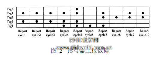 RFID標簽數據由讀寫器在每個報告周期reportcycle進行上報,在經歷多個報告周期之后,一個典型的RFID讀寫器上報數據如圖2所示。
