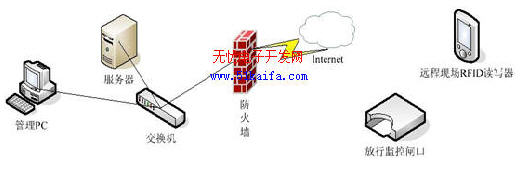 本系統組成簡單,無需復雜布線,主要有系統服務器,客戶端管理,無線手持終端PDA,放行監控閘口等組成。系統結構網絡圖如圖2 所示。