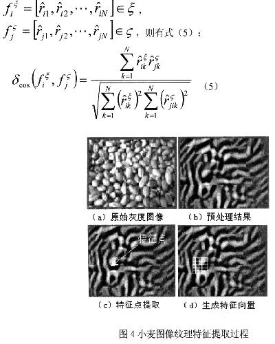 通過對糧食顆粒的灰度圖像進行紋理分析,獲得與結構相關的灰度分布的統計信息,可以實現對兩幅圖像的匹配分析,并作為判斷糧情變化的依據。對糧食顆粒灰度圖像的分析采用基于不變矩的圖像紋理的統計算法。該算法首先將原始圖像進行分塊,利用加窗傅立葉變換進行空域濾波增強,去除圖像在各個空間頻率處的噪聲,增強圖像中的紋理結構信息。然后選擇圖像中曲率最大的點進行特征提取,以提取的特征點為中心,對圖像進行局部的網格化處理,針對每個單元格計算其7個不變矩,對所有單元格各自的不變矩求和得到特征向量。同時借助最大類間方差閾值分割方法(OTSU),將圖中的單元格區分為前景和背景,并在求和時賦予不同的權重,可進一步提高圖像匹配的精度。小麥圖像紋理特征提取過程如圖4所示。最后利用特征空間中兩特征向量間的距離作為相似度衡量的標準。可采用余弦距離來表示。特征向量間余弦距離的定義為:設特征空間中兩特征向量分別為