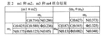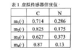 通過實際測量的數據,經過計算得到某一區域的四個虛擬傳感器信度值m1,m2,m3,m4如表l,用C表示可信度,N表示不可信度。