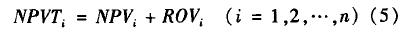 為標的資產價值波動的方差;N(·)為累積正態分布函數;e=2.718 3。 在項目的實物期權計算中,S為項目凈收益的現值; X為執行期權時的投資成本;T為項目投資有效期。此外,MARGRABE 得到將一項資產和另一項資產進行互換的期權定價公式,GESKE 得到具有確定性執行價格的復合期權定價解析解。需指出的是,RFID項目通常嵌入了復合期權,因此其計算通常會遇到兩方面困難:首先,實物期權具有不可加性,組合期權的價值可能會大于、等于或小于其分別計算的期權價值的總和;其次,需要在不同的期權序列中權衡,因為某一個期權序列可能在減少某類風險的同時增加其他風險,如延遲期權會降低市場風險但也會增加競爭風險。對于這類有相互影響作用的復合期權的計算,TRIGEORGIS糾進行了研究。根據實物期權理論,RFID項目最終的真實價值應包括兩部分,如式(5)所示: