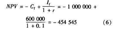 假設某大型零售企業正考慮實施基于RFID技術的供應鏈管理項目。該公司已建立包含RFID項目的經濟、技術和環境基本數據的數據庫。根據對數據庫中基礎數據和次級數據的分析和計算得出,為購置RFID標簽、讀寫器等軟硬件產品需要100萬美元的初始項目成本c f,假定初始項目的未來現金流量,lf在第一年年末收到,其值估計為60萬美元,基于項目風險,折現率r取10%。現在分析求解是否應投資這個初始項目。該公司初始RFID項目的NPV為: