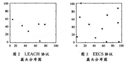 EECS算法的實質是在簇頭選擇階段,總是讓剩余能量最大的節點當選為簇頭;在成簇階段,聯合考慮普通節點與簇頭的距離,以及簇頭與基站的距離。其創新之處在于:只有小部分節點參加簇頭的競選;在局部范圍內廣播消息,選舉過程沒有迭代;以節點的剩余能量為競選參數;設計了簇頭之間負載均衡的策略。