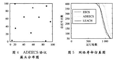 LEACH簇頭個數取最優值。在仿真中,LEACH簇頭個數為6;取T=0.15,R=26,w=0.8。由3種協議的簇頭分布圖(圖2~圖4)可以看出,LEACH協議簇頭隨機分布;EECS協議簇頭分布比較均勻,但存在簇頭漏洞問題;ADEECS協議簇頭真正實現了均勻分布。所以,提出的延遲發送競選消息的方法很好地解決了LEACH和EECS協議在簇頭選舉過程中存在的問題。