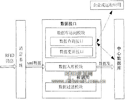 數據接口的結構圖如圖4所示。數據入庫模塊首先通過調用數據過濾模塊,將重復的RFID相關數據過濾掉,然后將過濾后的RFID相關數據移植到中心數據庫中。同時,數據接口中的數據訪問模塊提供了訪問中心數據庫的接口:數據查詢和數據更新接口,為企業應用乃至遠程應用程序提供服務。