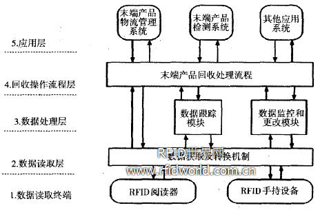 EPC(Electronic Product Code)的出現,促使RFID得到更大范圍的應用和發展,統一的編碼規則以及網絡化的數據庫接口,使得產品信息可以通過網絡進行查詢和更新。基于RFID技術的以上優點,可以建立末端產品信息系統,跟蹤產品從出廠到回收整個生命周期內的信息,這些信息使得末端產品的物理狀態和功能情況非常清晰,從而減少了回收過程中的檢測和評估環節,提高了末端產品處理的效率。基于RFID的末端產品信息管理系統的框架結構分為五層(如圖3所示),分別為數據讀取終端、數據獲取層、數據處理層、回收操作流程層和應用層。這五個層次相互配合,完成對末端產品信息的一系列操作,最終將末端產品的信息轉變為標準的可讀取形式,從而可以被應用系統調用。
