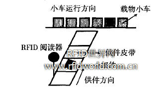 利用RFID方式在供件階段對郵件進行信息識別,在每臺供件臺的郵件整理端設置一臺RFID閱讀器,采用單一讀寫方式,這樣在供件過程中,郵件從皮帶機經過閱讀器的時候,閱讀器識別電子標簽號碼,然后檢索分揀系統數據庫,獲得郵件的目的滑槽號碼,并為郵件分配運載小車。在此階段如果郵件信息無法識讀,則控制系統可發布提示信息并禁止此郵件進入分揀系統。這樣可防止信息缺損郵件占用載物小車導致的分揀效率降低,還可減輕工人的勞動強度。圖2是供件臺處RFID閱讀器的安裝位置示意圖。實際的系統每一臺供件機配置一臺閱讀器,采用低頻近距離射頻系統,閱讀器采用近距離讀寫模式,防止設備對鄰近供件臺上的郵件信息的誤讀。在供件系統上應用的射頻識別系統,讀寫距離最好在1米的范圍之內,因為高效供件時,兩個相鄰郵件的距離一般小于80cm。另外相鄰供件臺之間的距離也在150cm的范圍之內甚至更短。另外RFID閱讀器必須采取防干擾措施,防止對相鄰郵件或相鄰供件臺郵件信息的誤讀同。