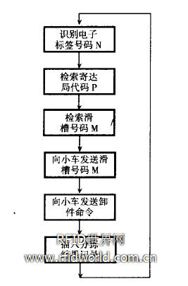分揀過程信息處理過程為:識讀器讀取郵件電子標簽號碼N,檢索分揀數據庫中的標簽號碼為N的信息記錄,獲取郵件的寄達局代碼P,然后檢索控制數據庫中寄達局代碼為P的分揀機滑槽號碼M。郵件被輸送到C號小車后,通訊系統向C號小車發送卸件到M號滑槽的命令。C號小車到達M號滑槽后卸下郵件,同時系統向分揀結果表中插入郵件分揀結果記錄。圖3說明了分揀過程信息處理的流程。