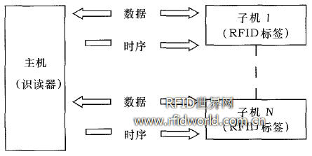 RFID系統的一個優點就是多個目標識別。在射頻識別系統工作時,在讀寫器的作用范圍內,可能會有多個射頻標簽同時存在。在多個讀寫器和多標簽的射頻識別系統中,存在著兩種形式的碰撞方式:一種是同一標簽同時收到不同讀寫器發出的命令,另一種是一個讀寫器同時收到多個不同標簽返回的數據。第一種情況在實際應用中要盡量避免,本文主要考慮實際系統中最容易出現的情況,即一個讀寫器和多個標簽的系統。在由一個讀寫器和多個射頻標簽組成的系統中,存在著兩種不同的基本通信形式:從讀寫器到射頻標簽的通信和從射頻標簽到讀寫器的通信。從讀寫器到射頻標簽通信時,讀寫器發送的數據流同時被所有標簽接收,而這些信息是由一個無線電廣播發射機發射的,這種通信方式也稱為無線電廣播。從射頻標簽到讀寫器的通信也稱為多路存取,即在讀寫器的作用范圍內有多個射頻標簽的數據同時傳送給讀寫器。無線電通信系統中多路存取一般采用以下方法把不同的信號互相分開:空分多路法(Space Division Multiple Access,SDMA)、時分多路法(Time Division Multiple Access,TDMA)、頻分多路法(Frequency Division Multiple Access,FDMA)、碼分多路法(Code Division Multiple Access,CDMA)。本文采用時分多路法對多個標簽進行識別,讀寫器控制采用輪詢法。