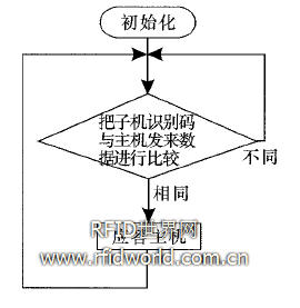 發射部分由微處理器ET44M210和發射模塊ET13X340A組成。微處理器的PortA.0作為信號輸出,接發射模塊的MOD,PortA.1接發射模塊的ENB,由微處理器控制 發射模塊的工作狀態。根據編碼原則,發射部分周而復始的把子機識別碼與主機發來的數據進行比較。這里要注意的是起始脈沖要足夠寬,使得接收部分能夠正確識別數據串的起始位置。發射部分程序框圖如圖3所示。子機的程序結構相對簡單,用戶開機后,子機開始把自身唯一的識別碼與主機發來的數據不斷進行比較,若相同,則應答;若不同,則繼續比較。
