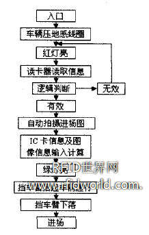 當車輛進入入口時,車輪壓地感線圈,系統感應到檢測車輛(in圖2),紅燈亮,在車輛進入發射天線工作區域時,系統自動感應到車上的標示卡(RFID),將圖像傳送至入口計算機,計算機檢查卡號的有效性并控制攝像頭抓拍車輛圖像。經判斷后進行如下處理: