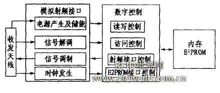 (1)模擬射頻接口模塊:包括射頻收發天線、負責將射頻訊號轉換成DC電源的電源產生電路、電能存儲電路、信號調制和解調以及時鐘發生電路。