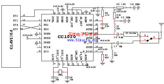 CC1020有32個引腳,它通過PDI、PDO、PCLK和PSEL這四個引腳與PIC16F73單片機的I/O端口相連,CC1020的應用原理圖如圖2所示。