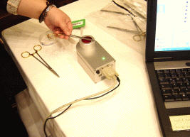 Olympus是日本國內市占率極高之醫療器材供應商,其目前供應市場之產品已于2008年開始全數導入ID辨識技術;在儀器方面使用RFID技術,而在工具方面則采用QR Code二維條碼以雷射標記方式刻在工具表面,如圖(1)所示,其中較為特殊的是讀QR Code的讀取器,是Olympus費時一年才突破解決不銹鋼光滑反光表面反射干擾問題,始得標記在光滑不銹鋼表面之QR Code能被讀取無礙。