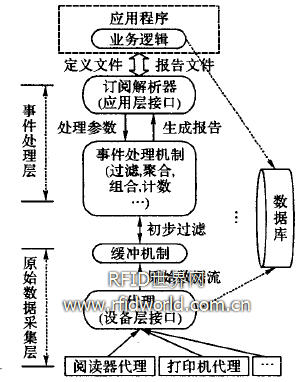RFID中間件位于企業應用程序與底層設備之間,提供統一的應用邏輯接口與設備接口,在實際應用中起到讀寫器的管理和數據的處理、傳遞功能。它的最終目的是數據為上層系統所用。如圖2所示,功能上可分為原始數據采集層和事件處理層。