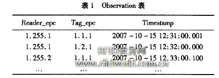 RFID閱讀器每秒鐘會閱讀到成千上萬的標簽,為防止溢出,采用線程來加速包的卸載,并將數據保存在即時隊列中。這里線程和數據隊列構成了一個緩沖機制,以滿足計算機的實時處理要求,它可以平滑從閱讀器接收到的大量簡單重復無序數據,按要求進行處理。每個閱讀周期 (讀周期是和讀寫器交互的最小單位)線程接收一組EPCs(標簽EPC,閱讀器ID,時間戳)組合,將其發送到消息隊列,對其進行事件有效性驗證,檢查是否出現讀寫錯誤或漏讀,實現對數據的初步過濾。正確讀取的數據記錄在數據庫的Observation表中。
