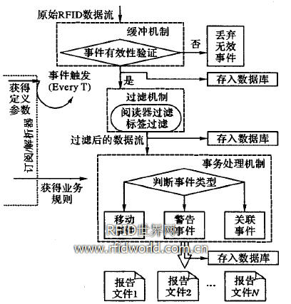 事件處理層位于原始數據采集層和業務邏輯之間。它根據上層系統發送的定義文件和回發地址,生成報告文件,按發布/訂閱機制將報告反饋給系統 J。原始數據采集層提供了硬件的統一接口,事件處理層則定義了應用系統對RFID中間件的標準訪問方式。它對原始RFID數據進一步處理,使數據轉化為上層系統需要的形式。圖3為RFID數據處理流程。
