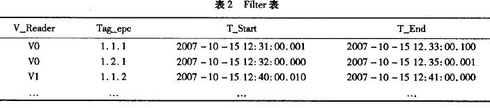 為解決上述問題,對標簽重復,我們只記錄標簽第一次出現和最后一次出現的時間;對閱讀器重復,一是在布置閱讀器位置時考慮到交疊情況,盡量用最少的閱讀器數量覆蓋全部區域。但為了提高識讀率,往往不能避免交疊。這里采取的是虛擬閱讀器的方法,同一地區的多個閱讀器組成一個虛擬閱讀器。如圖4的R1,R2,R3,R4共同組成一個虛擬閱讀器V0。過濾后的數據存放在表2中,T—Start為V~Reader初次閱讀某標簽的時間,以后再讀到該標簽則更新T—End和Count值(Coum為標簽讀取次數,有時為簡便起見,可略去)。
