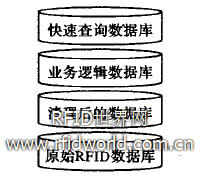 傳統的數據庫更新并不頻繁按設定的時間進行。但RFID數據庫的更新非常頻繁。閱讀器不斷的讀入原始數據,進行過濾、聚合處理后的數據要進行存儲,上層應用程序又不斷地進行查詢,使得RHD數據庫的構建和傳統數據庫不同,需要分層建立。如圖5所示:底層是原始RHD數據庫,過濾聚合(清理)后的數據庫位于第二層,然后是業務邏輯層,為便于查詢,最上層由需要頻繁查詢的數據組成。這些層次對應著中間件數據處理的不同階段。