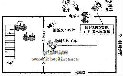 開發中間件,首先要模擬倉庫環境。由于標簽的價格原因,我們不可能在每個貨物上都貼上標簽,只能通過標示托盤來追蹤貨物。如圖1所示,在每個托盤、叉車和出入庫人員上安裝和佩戴射頻標簽卡,并在車間和倉庫出入口安裝讀寫器,通過讀寫器獲取RFID標簽經過出入口的情況,從而將托盤上所屬倉庫的信息與射頻卡捆綁輸入數據庫,同時記錄叉車和人員的出入庫情況。在出入I:1安裝攝像頭,判斷通過出入口的貨物數量。