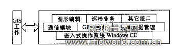 嵌入式GIS系統應用軟件的系統結構因具體應用的不同而有所增減。如圖2所示為嵌入式GIS系統應用軟件所應具備的幾個基本功能模塊。通常該類系統最底層應為嵌入式操作系統Windows CE,然后上面依次為核心處理層和應用邏輯層。整個體系結構與GIS工作站和WebGis系統進行數據交互,便于進行業務裁剪和對外發布。